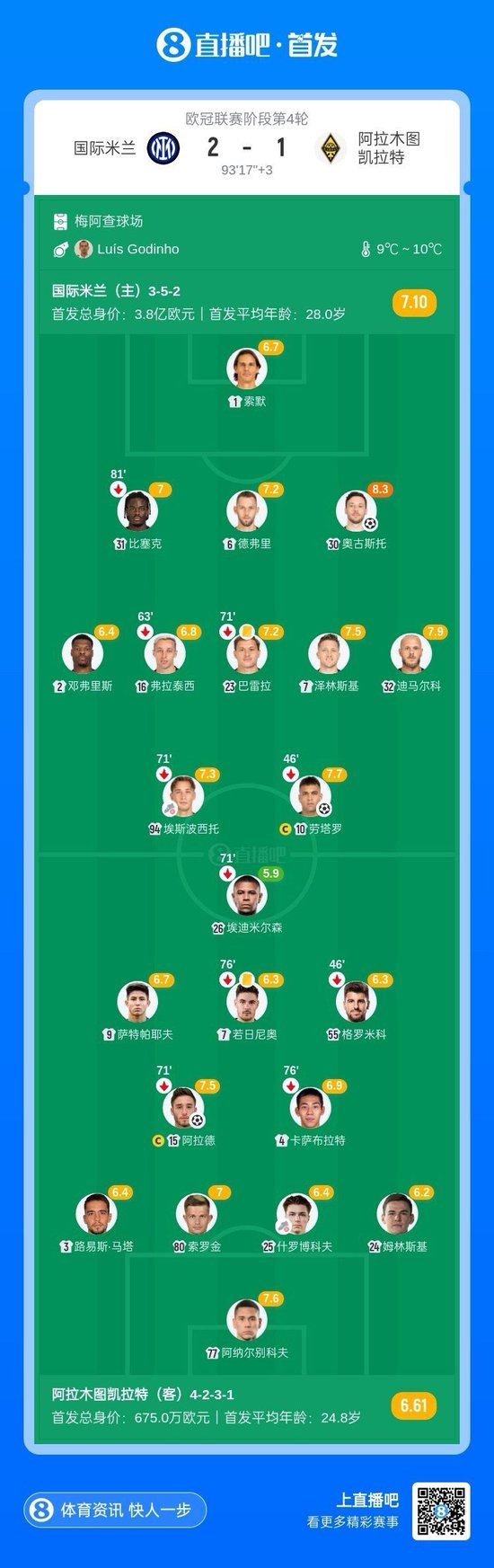 直播吧11月6日讯 北京时间11月6日凌晨4时整,2025-26赛季欧冠联赛阶段第4轮在梅阿查球场展开角逐,国际米兰主场迎战阿拉木图凯拉特。上半场劳塔罗打破僵局+屡失良机,下半场国米遭扳平+本赛季欧冠首粒丢球。最终国米主场2-1战胜阿拉木图凯拉特,国米欧冠前4轮取得全胜位居第3名,凯拉特1平3负未尝胜绩。