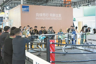 11月5日,第八届中国国际进口博览会在上海开幕。图为参观者在杭州宇树科技股份有限公司展位观看人形机器人格斗。本报记者 瞿芃 摄